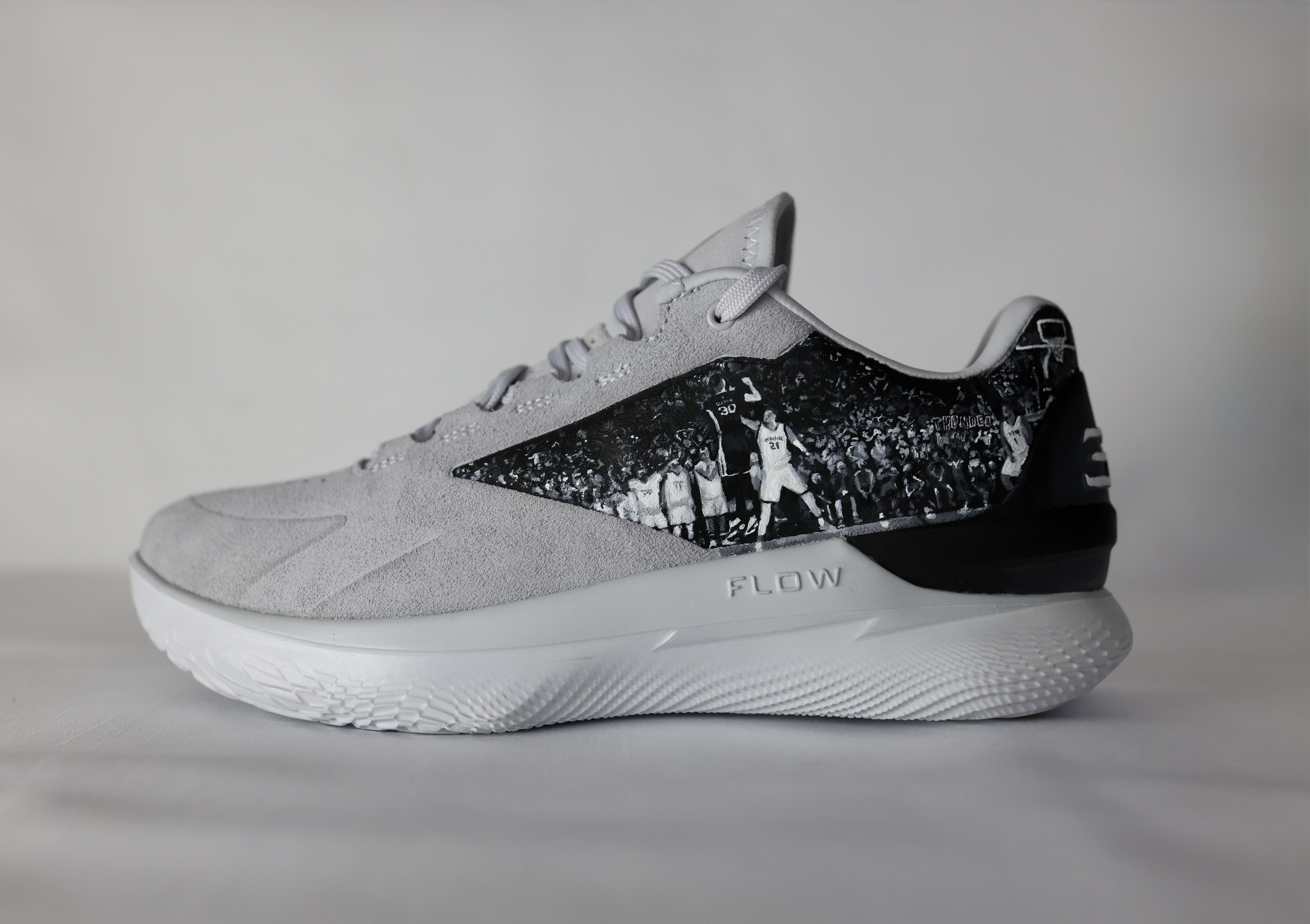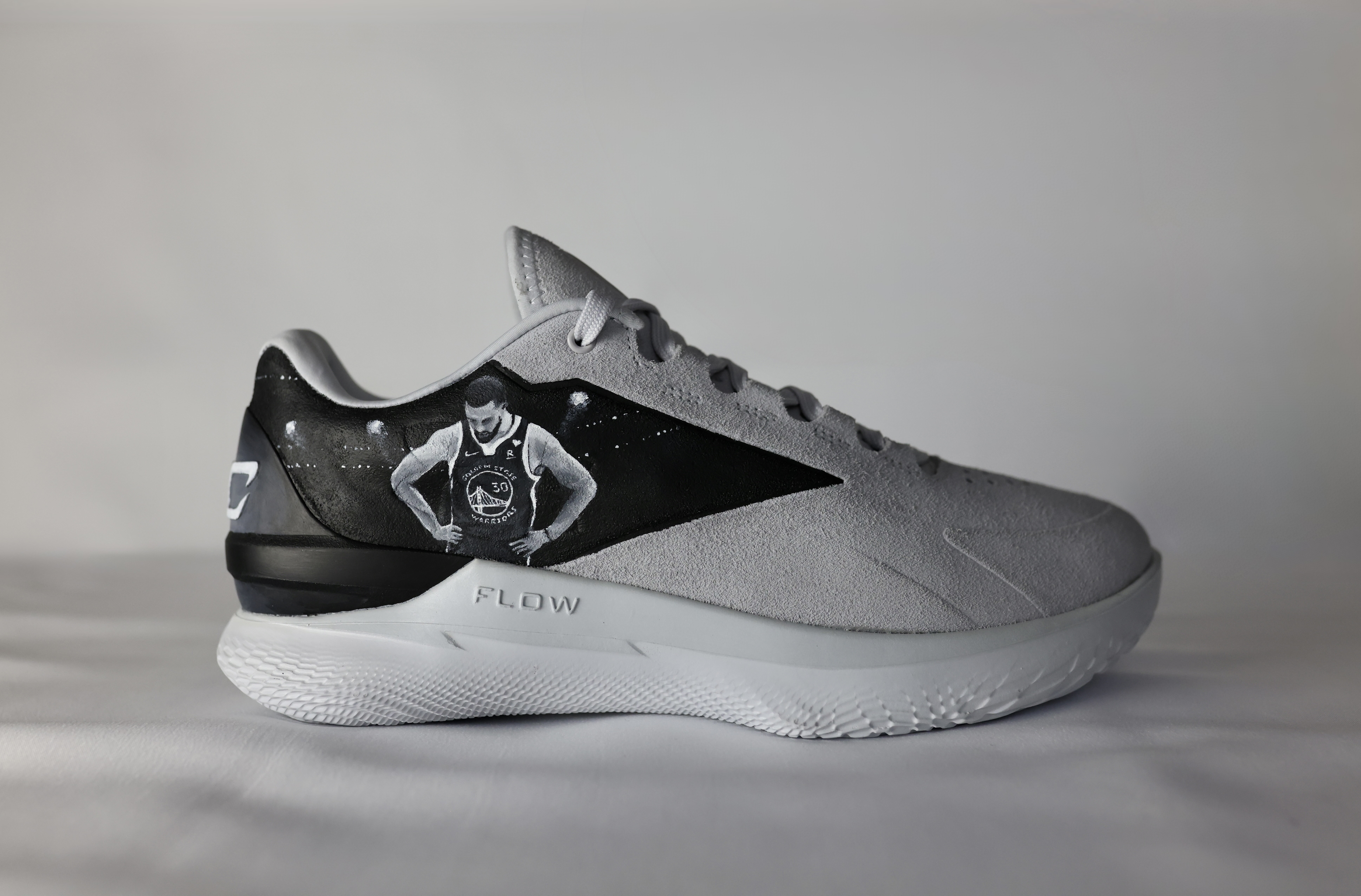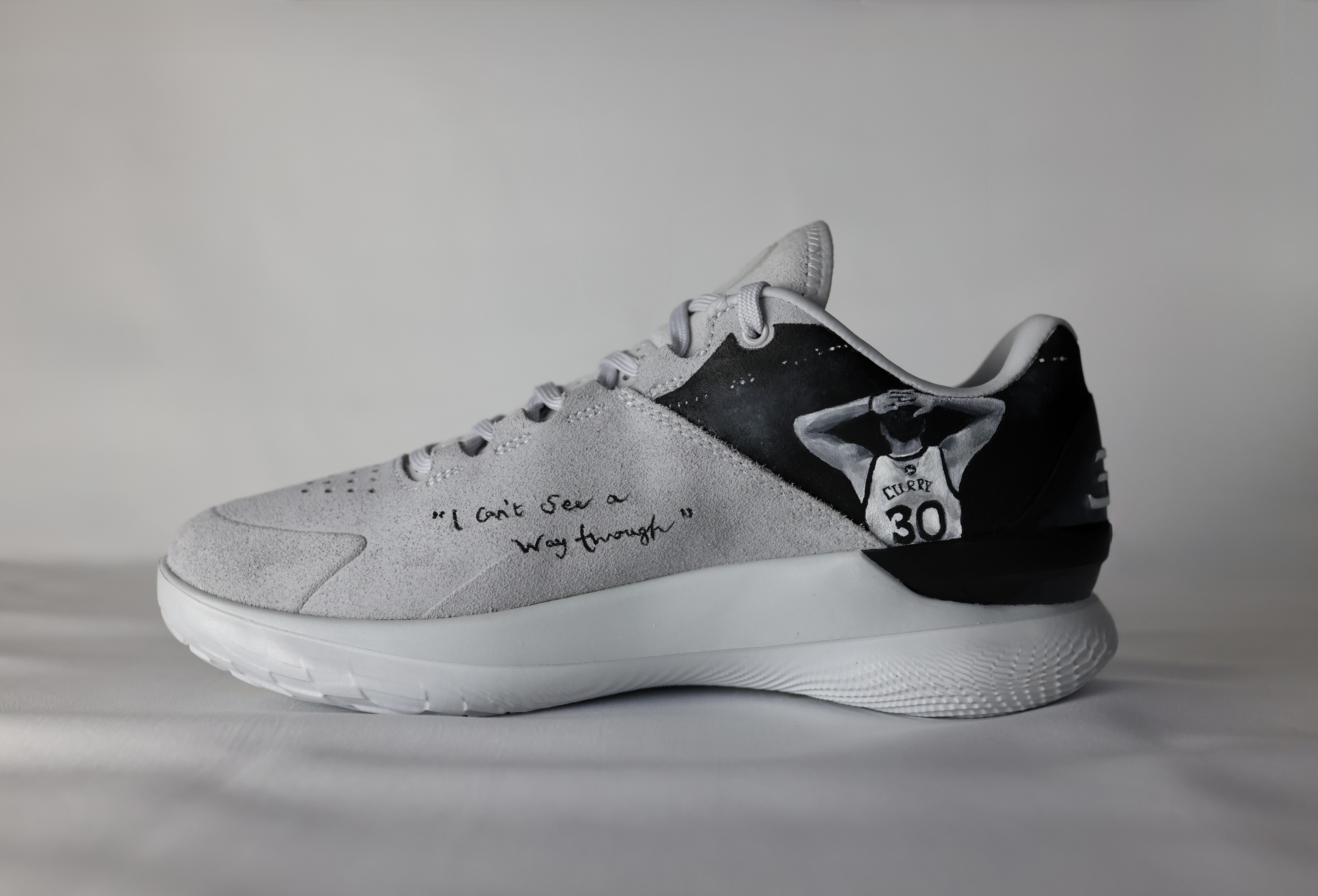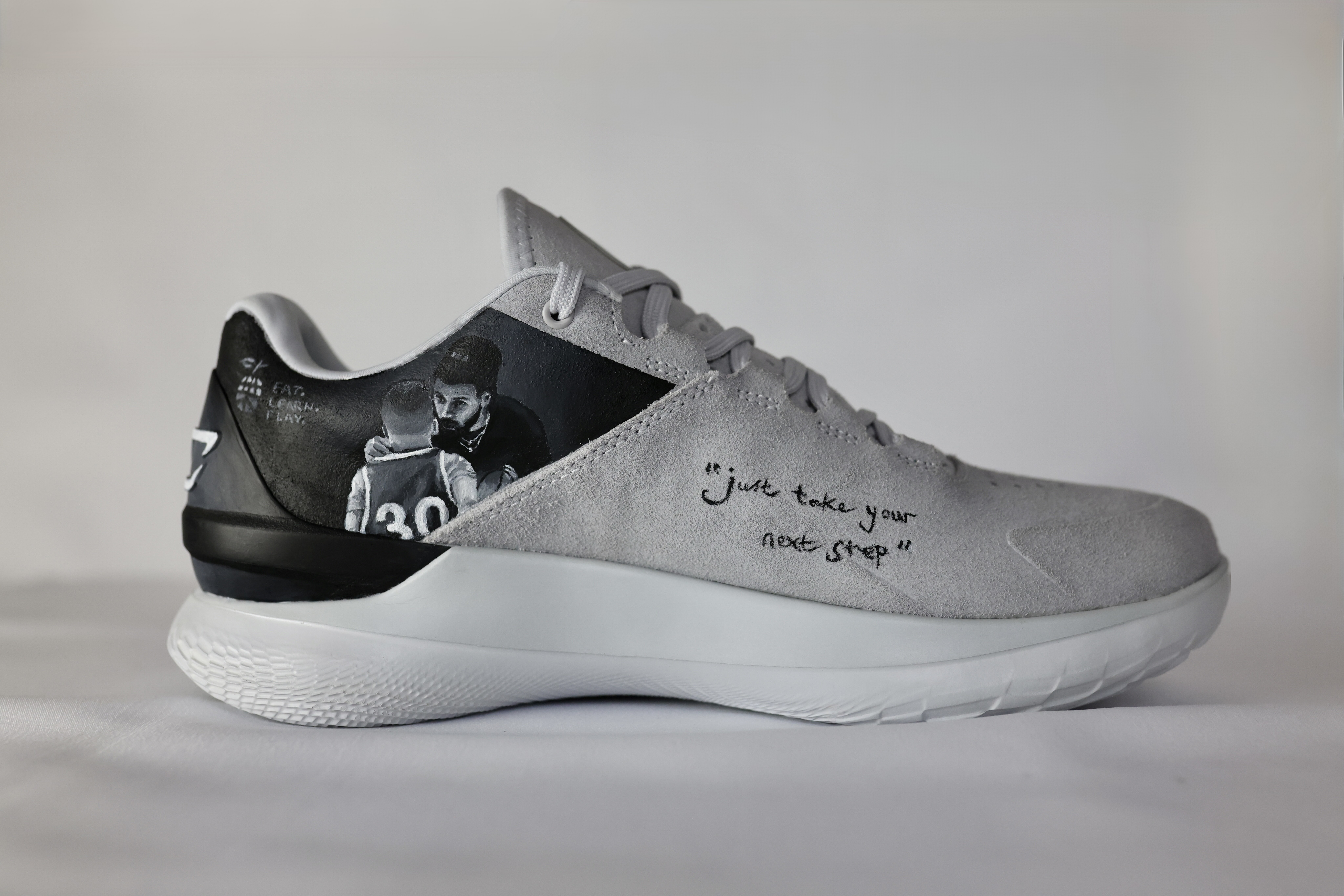 Curry flow trainers painted for NBA basketball Steph Curry. Design inspired by Charlie Mackesy quote, supporting mens mental health.